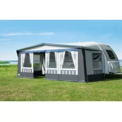 Das Wohnwagenvorzelt Frankana Freiko Rhön DC ist ein Dauervorzelt, bestehend aus robustem PVC-Gewebe. Es ist ideal für Saison- und Dauercamping geeignet. Die Vorderwand besteht insgesamt aus 4 Teilen, jedes Element kann bei Wunsch einzeln herausgenommen oder für den beliebten Verandaeffekt abgeklappt werden. Die hochrollbare Türe kann rechts, links oder mittig in der Vorderwand eingesetzt werden.