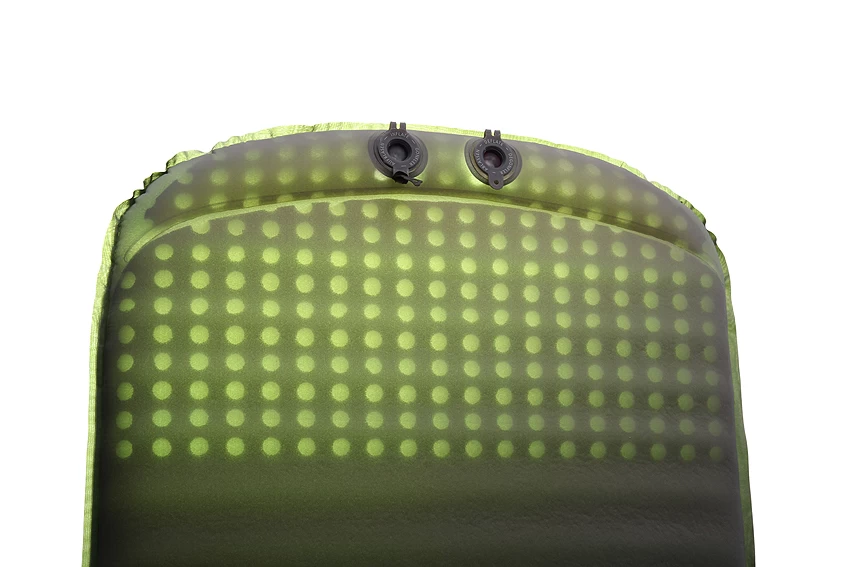 - Die beiden Flach-Ventile, eines für den Lufteinlass, das andere für den Luftablass, erlauben rasches Befüllen und Entlüften beim Zusammenrollen. Da diese flach und nicht in die Randnaht eingesetzt sind, stehen sie nicht hervor und sind somit perfekt geschützt.