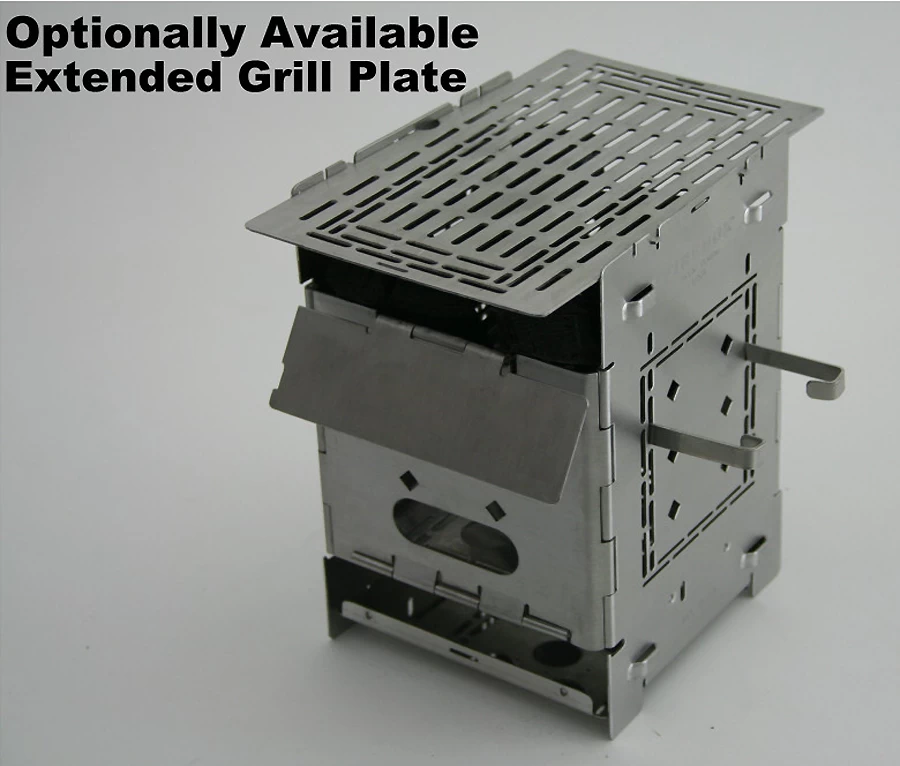 - Ein teilweise wegklappbarer Windschutz am oberen Rand der Firebox erlaubt den Betrieb des Kochers auch bei starkem Wind – so lässt sich die Firebox auf drei Seiten schließen; auf der Wind abgewandten Seite bleibt oben eine Öffnung zum Nachlegen von Brennmaterial.