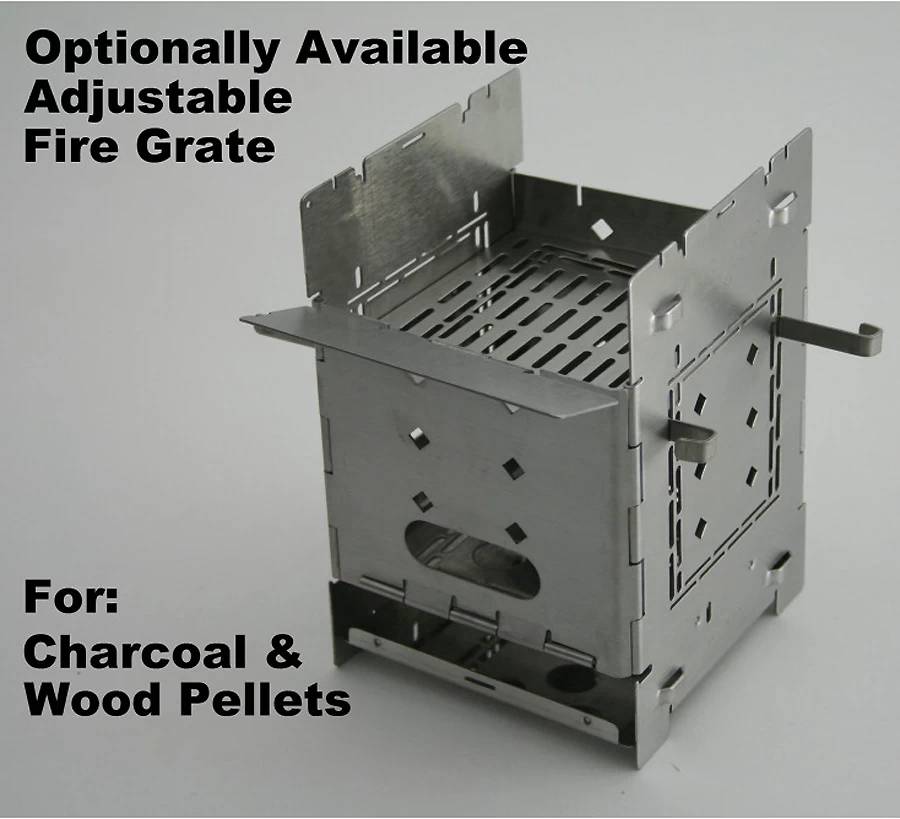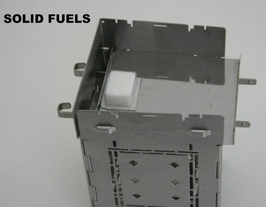 Er kann mit vielen Brennstoffen betrieben werden, direkt über Brennstoffe wie Holz, Pellets, Holzkohle oder dergleichen, oder mit optionalen Brennern wie z.B. dem Trangia-Spiritus-Brenner, oder mit Gelbrennern oder Gasbrennern.