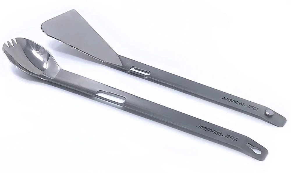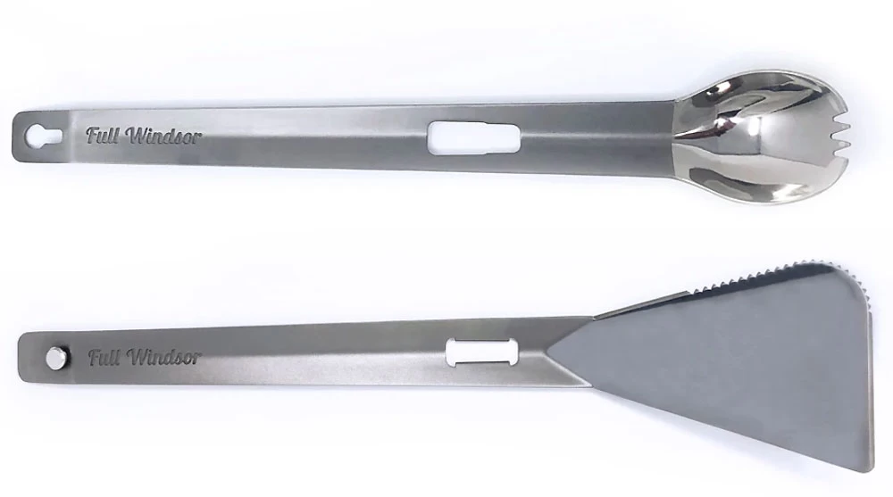 - Der Splitter besteht aus zwei separaten Titanutensilien, einem Spatel und einem langen Spork