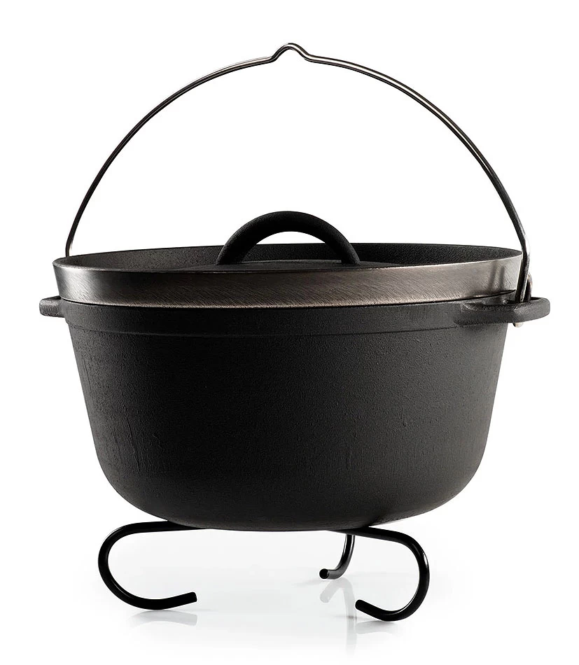 und bringt ein Dreibein für den Einsatz in der Kochfeuerglut mit