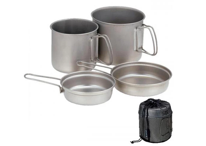 Für alle Ultraleicht-Backpacker: Ultraleichtes Titan-Kochtopfset bestehend aus 2 Töpfen mit eingestanzter Skala und Klappgriffen sowie 2 Titanpfannen mit arretierenden Klappgriffen.