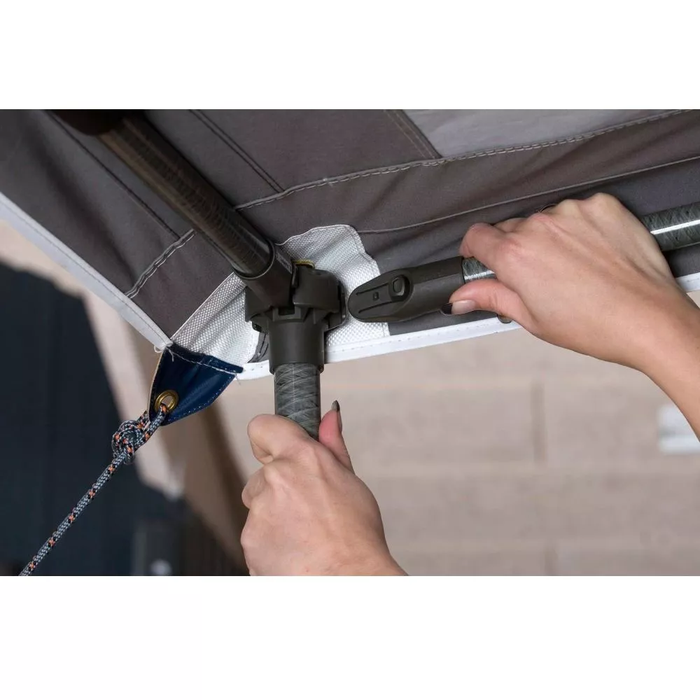 Das CarbonX Gestänge mit IsaFix-Schnellverschlüssen und Tectum Pro Verbindungselementen für den einfachen Zusammenbau der Stangen ermöglicht einen schnellen Aufbau und ein geringes Gewicht. Im mitgelieferten Gestänge- und Zeltsack lässt sich das Sonnendach transportieren und aufbewahren.