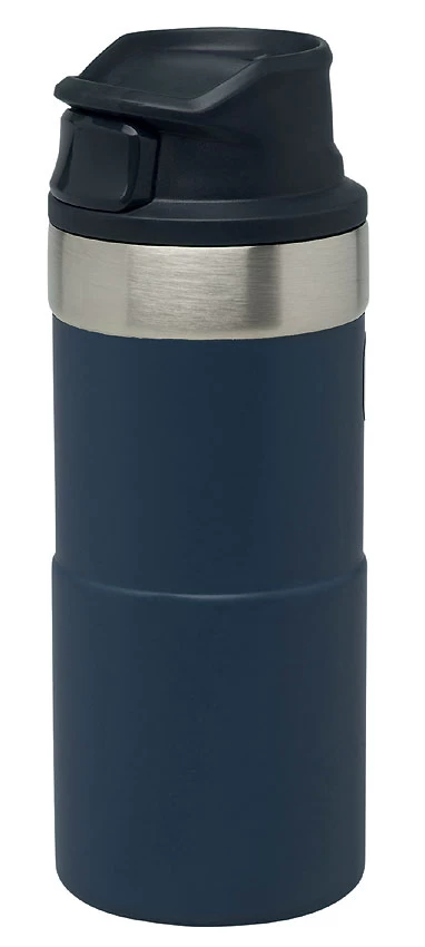 ein stabiler, sehr gut isolierender Thermobecher aus doppelwandigem Edelstahl, mit Einhandbedienung