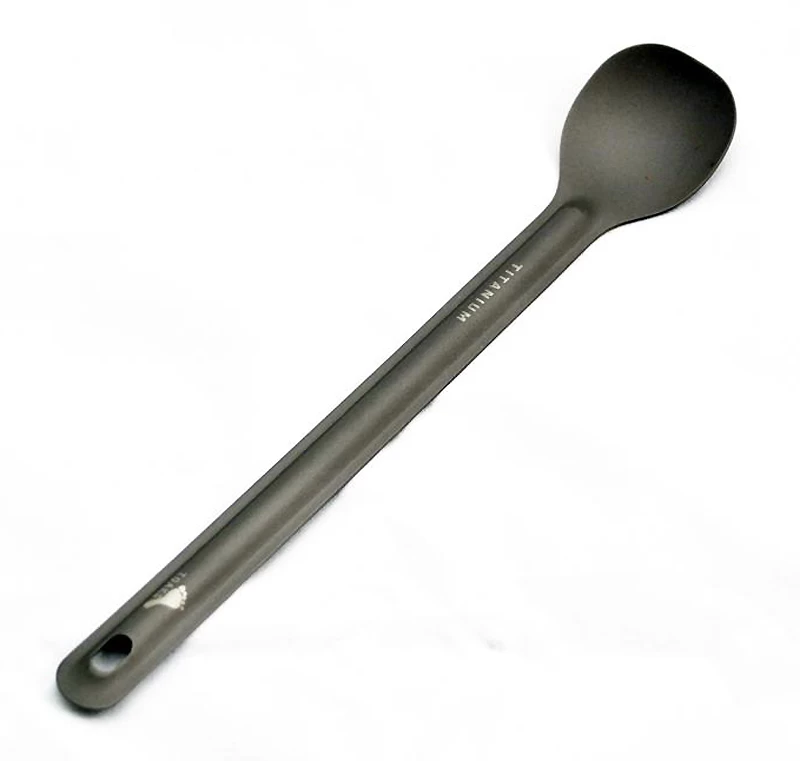 Ein ultraleichter Titanlöffel mit langem Griff, besonders auch geeignet zum Löffeln aus Trekking-Nahrungstüten. Viele gewichtsbewusste Trekker sparen sich ja das Kochgeschirr und essen aus der Tüte.