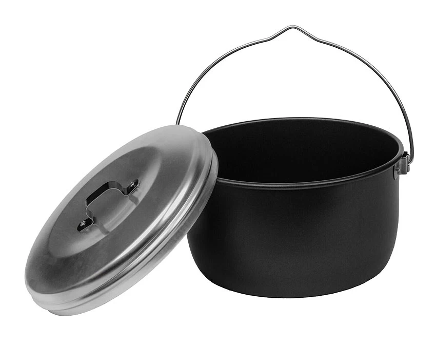 Ein Lagertopf für die kleinere Gruppe oder Familie, mit Deckel und Henkel. Der Deckel hat jetzt einen aufgenieteten Metallgriff, der etwas höher als der alte Griff ist und es erlaubt, mit einem Stock, einer Gabel oder ähnlichem den Deckel zu handhaben. Auf offenem Feuer besser als die alte Version.