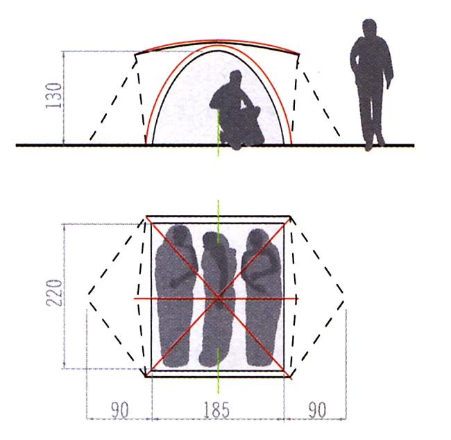 Außenzelt: 100% Polyester 70D 185T, Polyurethane beschichtet, Nähte getaped, 3.000 mm WS