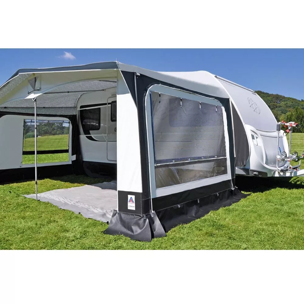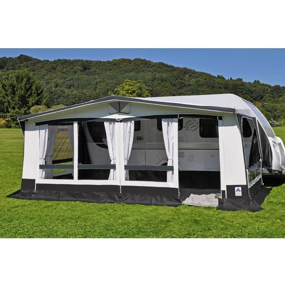 Alle eingearbeiteten Fenster sind bodentief, so dass mehr Tageslicht ins Vorzeltinnere gelangt, als bei anderen Wohnwagenvorzelten. Eine Seitenwand enthält ein grosses Fenster mit Moskitogaze und einer klaren Abdeckung mit Reissverschluss, die andere Seitenwand enthält ein grosses Fenster und eine Tür. Auch dieses Fenster enthält ein praktisches Moskitogaze. Die eingearbeitete Tür ist seitlich wegrollbar. Alle Fenster sind mit Gardinen ausgestattet, die mit einer praktischen Rollenaufhängung ausgestattet sind. So erhältst du eine noch wohnlichere Atmosphäre in deinem Urlaub.